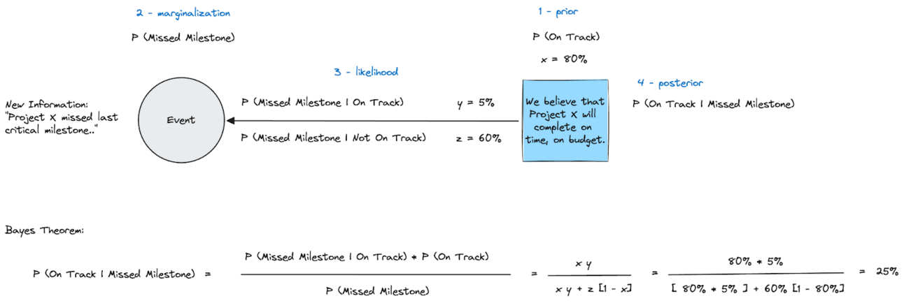 We apply Bayes Theorem to find that the calculated probability that Project X is on track, given the missed milestone, is 25%.