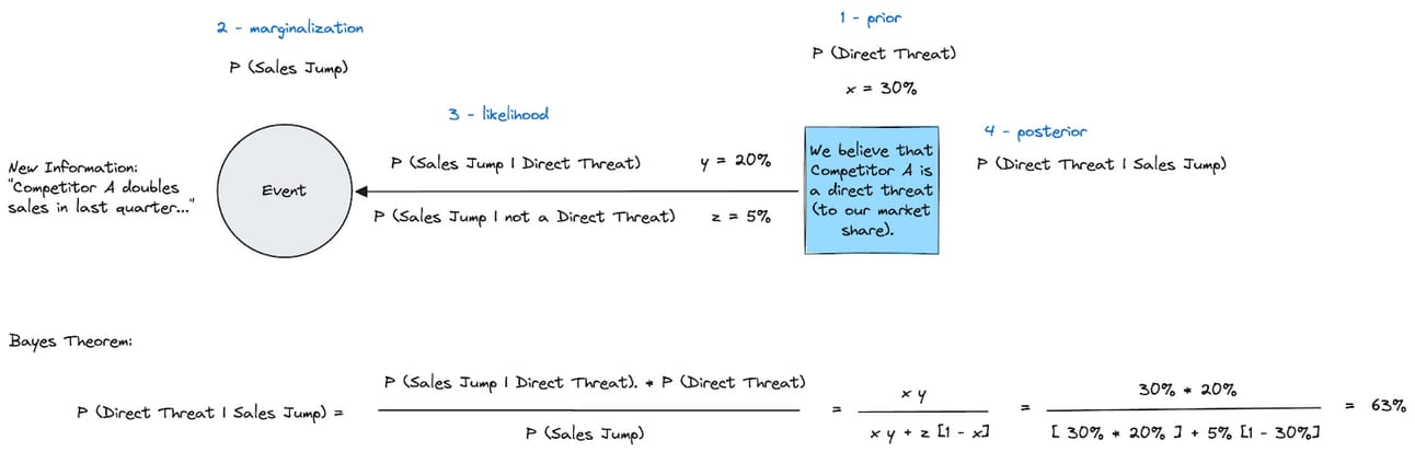 We apply Bayes Theorem to find that the calculated probability that Competitor A is a threat, given their recent sales jump, is 63%.