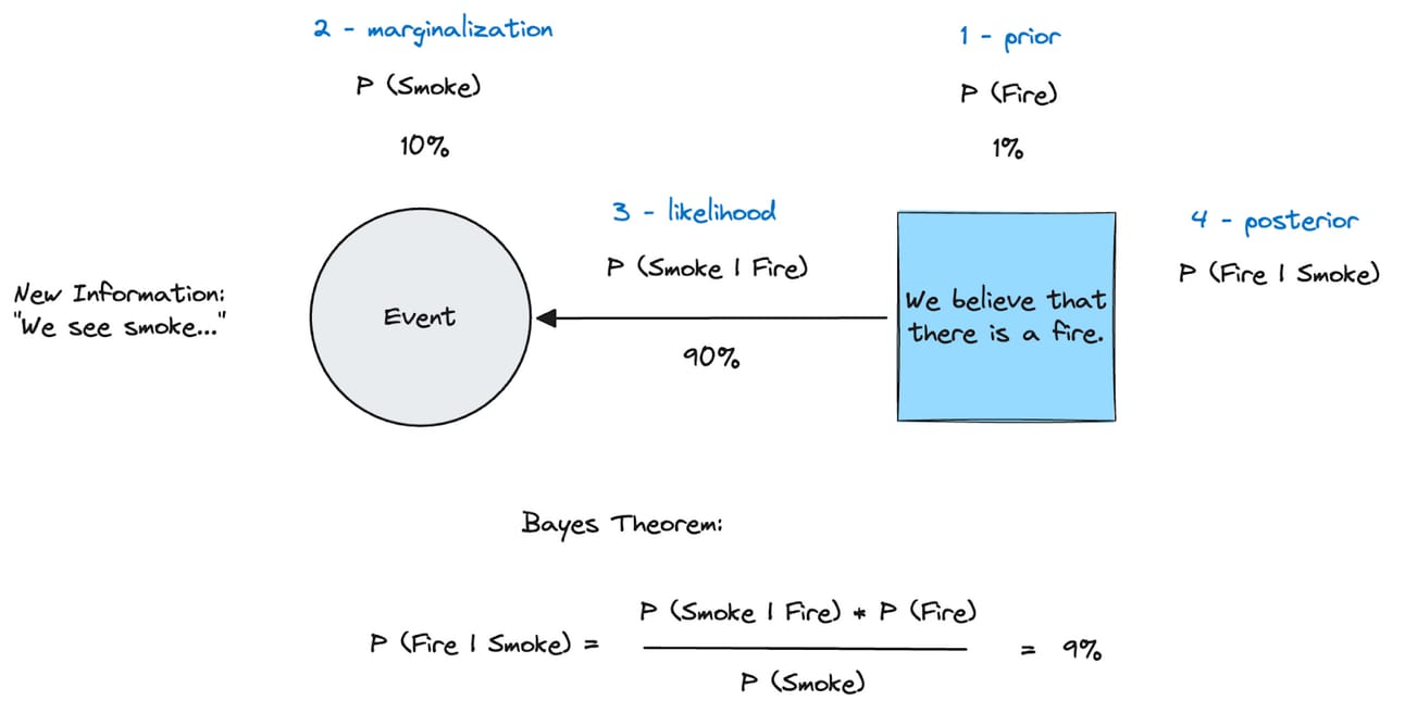 So through this exercise, we took the new information (“we see smoke”) and might revise our probability of a fire from 1% to 9%.