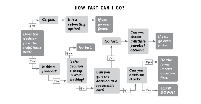 Tools to improve decision making speed may be the most familiar, and many of the popular techniques were made popular at Amazon and through other influential, celebrity CEOs. Reid Hoffman’s Chief of Staff said that his first principle of decision making was ‘speed’