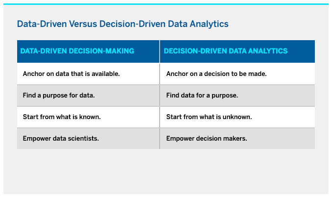 Leading with decision-driven data analytics: A very practical and actionable take on shifting from data-driven to decision-driven. “To move to a decision-driven data analytics approach, a company must start by identifying the business’s key decisions and the people who make them, and finding data for a purpose rather than finding a purpose for the data at hand.” An excerpt from the article: