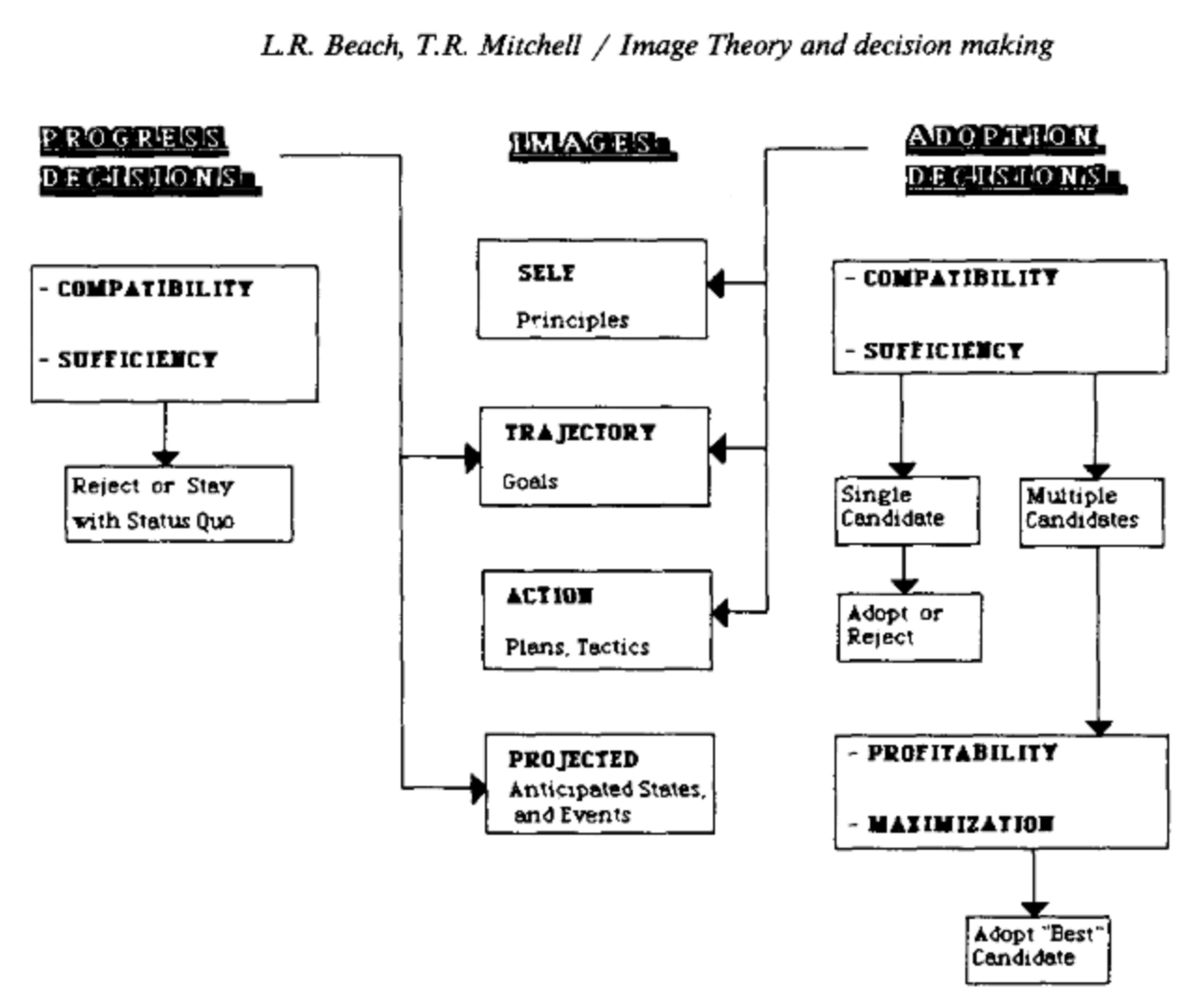 Image theory has been influential in theorizing how mental images might play a major role in how we model strategic decisions - essentially creating a picture of our beliefs and values, what success looks like, our action plan, and potential ways the plan unfolds.