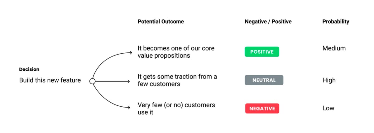 Building an outcome tree is quite simple. The goal is to understand the possible outcomes of the decision in order to have a conversation about confidence and risk.
